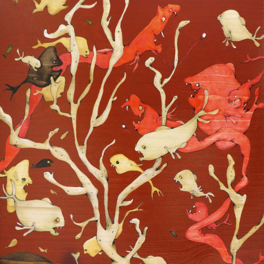 Toutes ces peintures sont réalisées sur des panneaux de bois, essentiellement avec de la gouache et de l’aquarelle.